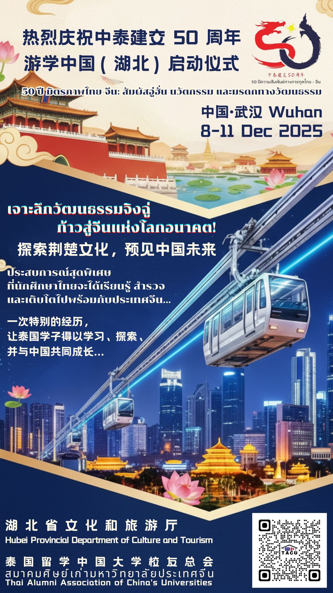 ในวาระอันเป็นมงคลยิ่งของการเฉลิมฉลองครบรอบ 50 ปี ความสัมพันธ์ทางการทูตไทย-จีน สำนักงานกรมวัฒนธรรมและการท่องเที่ยวมณฑลหูเป่ย และ สมาคมศิษย์เก่ามหาวิทยาลัยประเทศจีน ขอเรียนเชิญนักศึกษาระดับปริญญาตรี เข้าร่วม พิธีเปิดตัวโครงการศึกษาดูงานสุดพิเศษ ณ เมืองอู่ฮั่น!