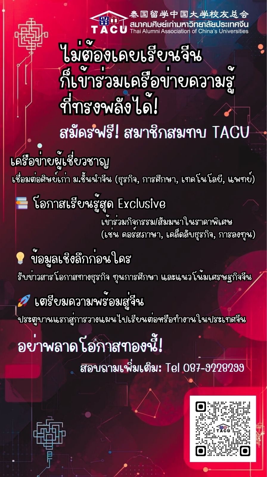 อย่าพลาดโอกาสทองนี้! สมัครสมาชิกสมทบ (ฟรี) เพื่อเข้าร่วมเครือข่าย TACU และเปิดโลกสู่ประเทศจีนของคุณ!